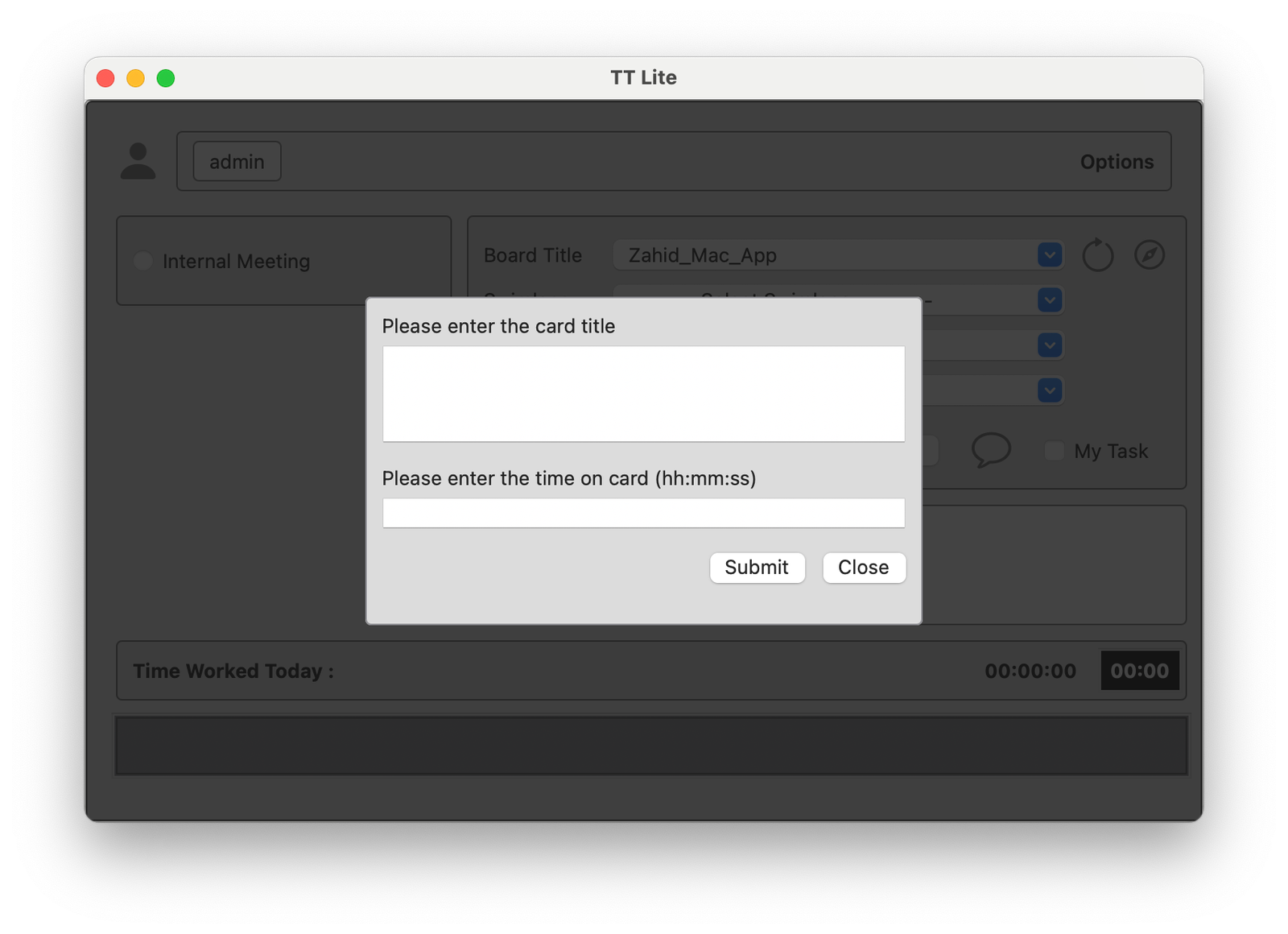- Pop-up modal for entering task details, including card title and time allocation (hh:mm:ss).
